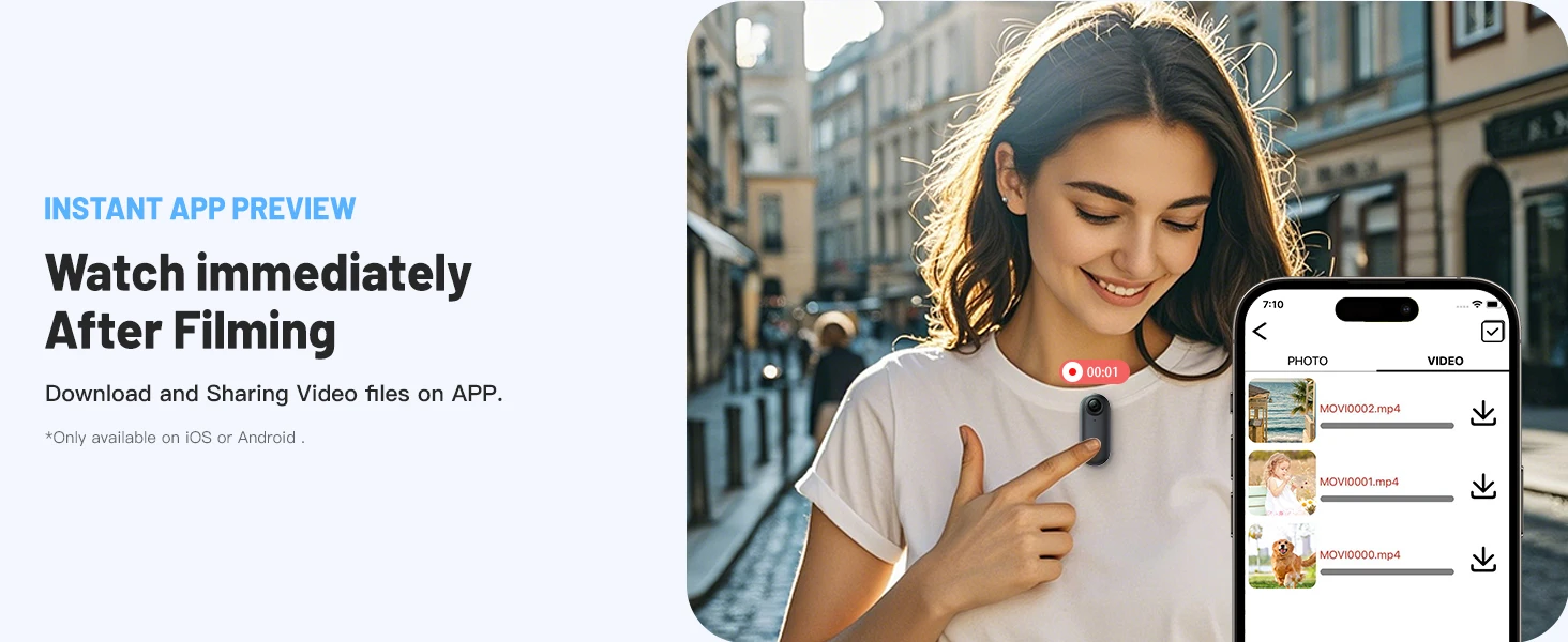 Hands Free: You can attach the camera with the magnet pendant, then hanging around the neck with safety cord to get dual protection. The portable back clip has 360°adjustable rotation, you can easily change the angle. Free your hands and complete the video